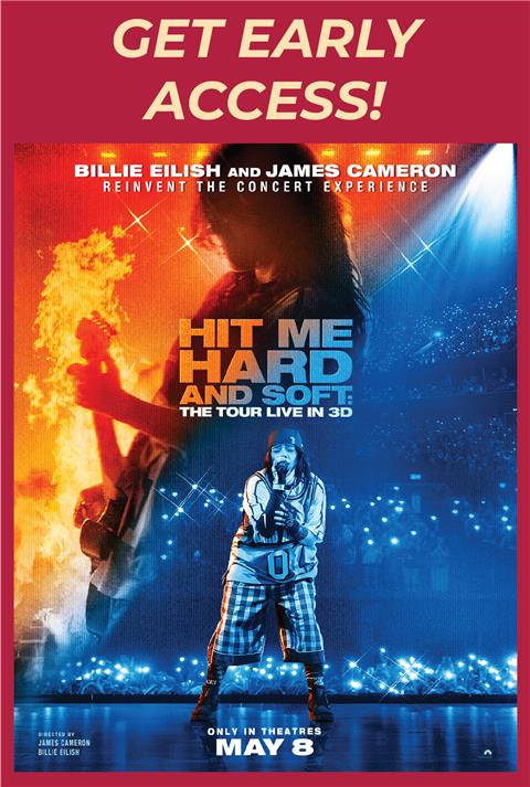 Captured during her sold-out world tour, BILLIE EILISH - HIT ME HARD AND SOFT: THE TOUR (LIVE IN 3D) brings an innovative new concert experience to the big screen from one of the most celebrated and successful artists of her generation. Presented in immersive 3D, the film is directed by Academy Award® winners James Cameron and Billie Eilish, in theatres May 8, 2026. Be the first to see it at an Early Access Movie Event on Wednesday, April 29 at select theatres nationwide. Fans in attendance will see bonus content and will receive a limited edition collector's ticket with ticket purchase - while supplies last.